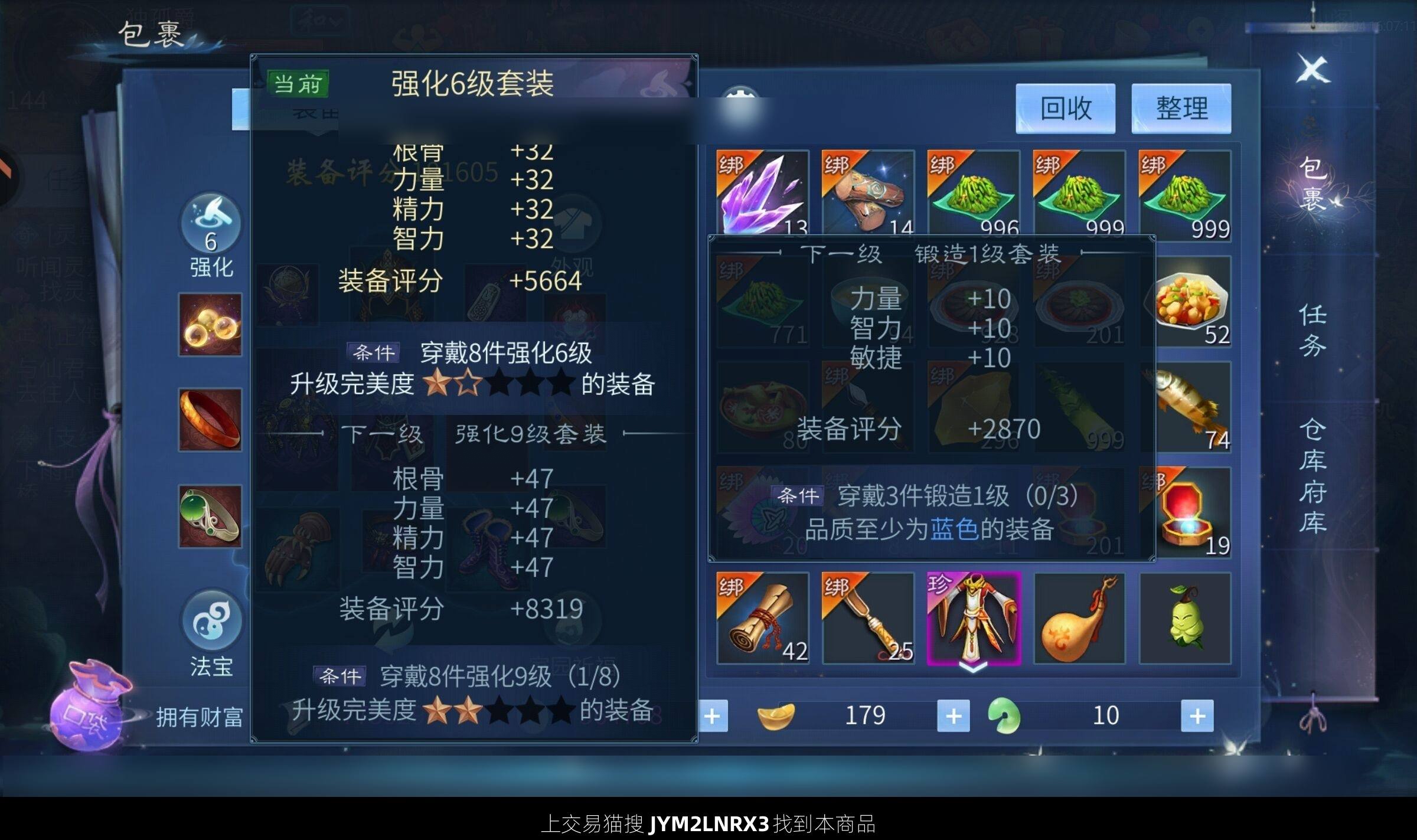 初始号有有2个东陵玉箱子(绑定)和武扬令,强化6级采集47,钓鱼47,烹饪47